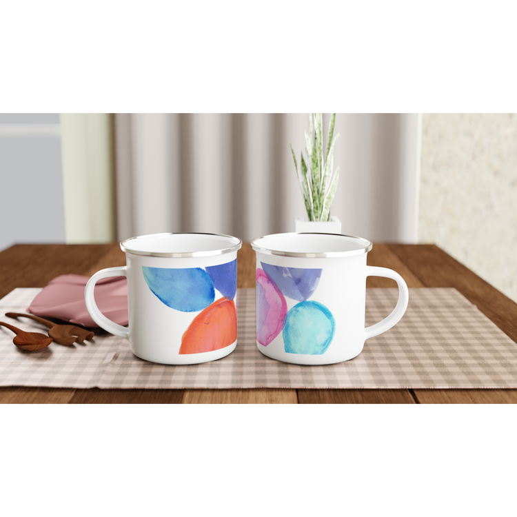 This collection of white enamel mugs is designed for outdoor lovers, travelers, artists, and anyone who enjoys timeless, practical objects for daily use.